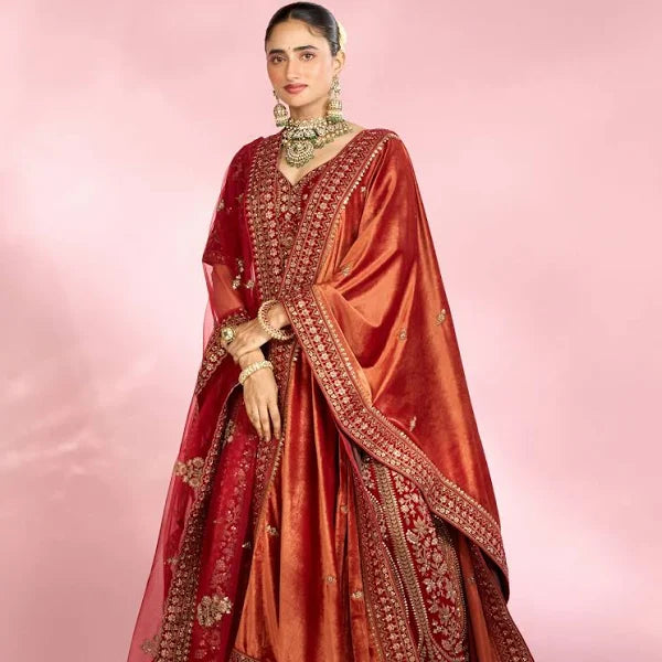This luxurious bridal lehenga showcases a rich velvet base in a captivating berry-red hue blended with an orangish tone, lavishly adorned with hand embroidery, sequins, stonework, and zari detailing. The ensemble includes a matching lehenga, blouse, sheer light-orange dupatta, contrasting velvet-red dupatta, belt, and decorative latkans—creating a cohesive and regal wedding look. Each piece is crafted with meticulous care by skilled karigars, and the garment requires dry-clean only care.