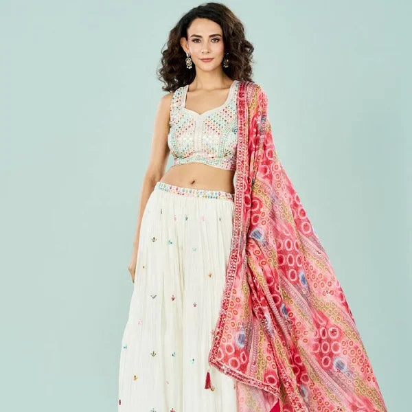 This elegant three-piece ensemble—comprising a skirt, top, and dupatta—is crafted from luxuriously soft high-quality crepe fabric in a serene cream shade, exuding understated sophistication. It’s adorned with a delicate mix of sequin, thread, and zari work, giving it a subtle yet festive shimmer. Designed for comfort and grace, it’s the perfect choice for wedding festivities or celebratory events, and it’s dry-clean only to preserve its finish.